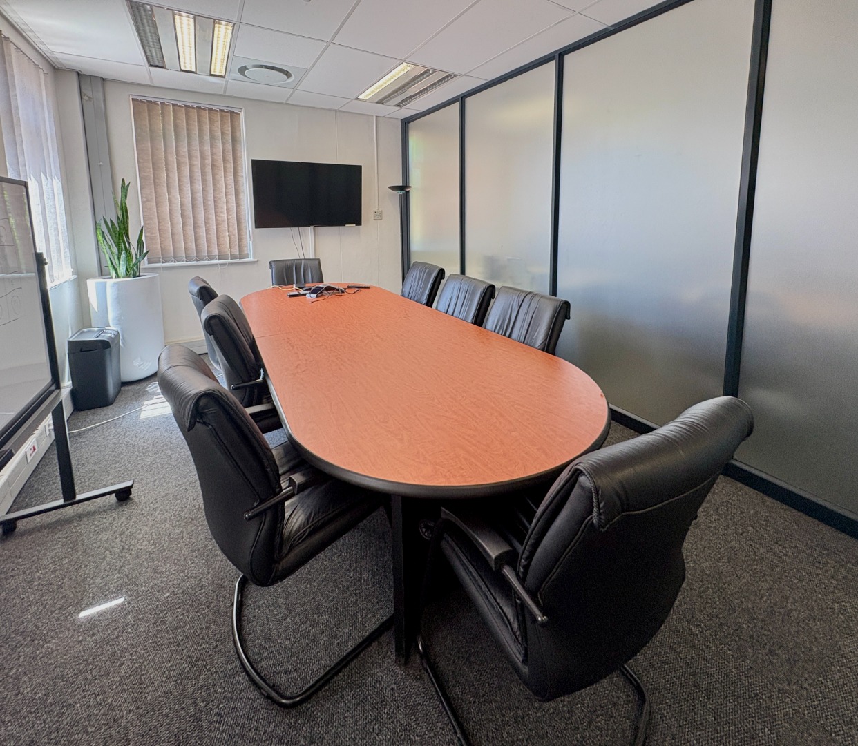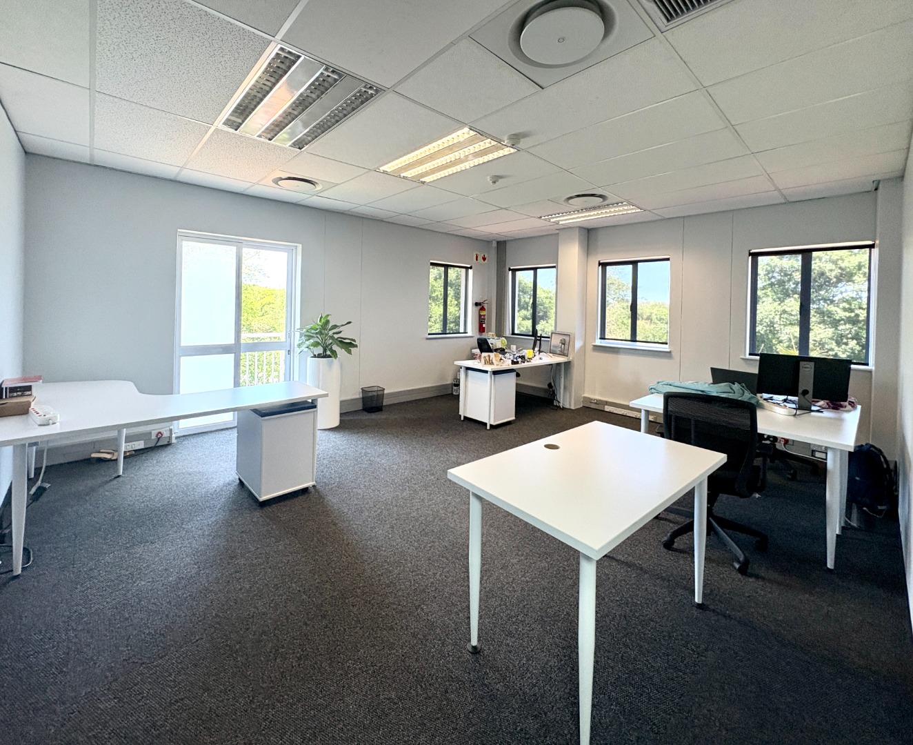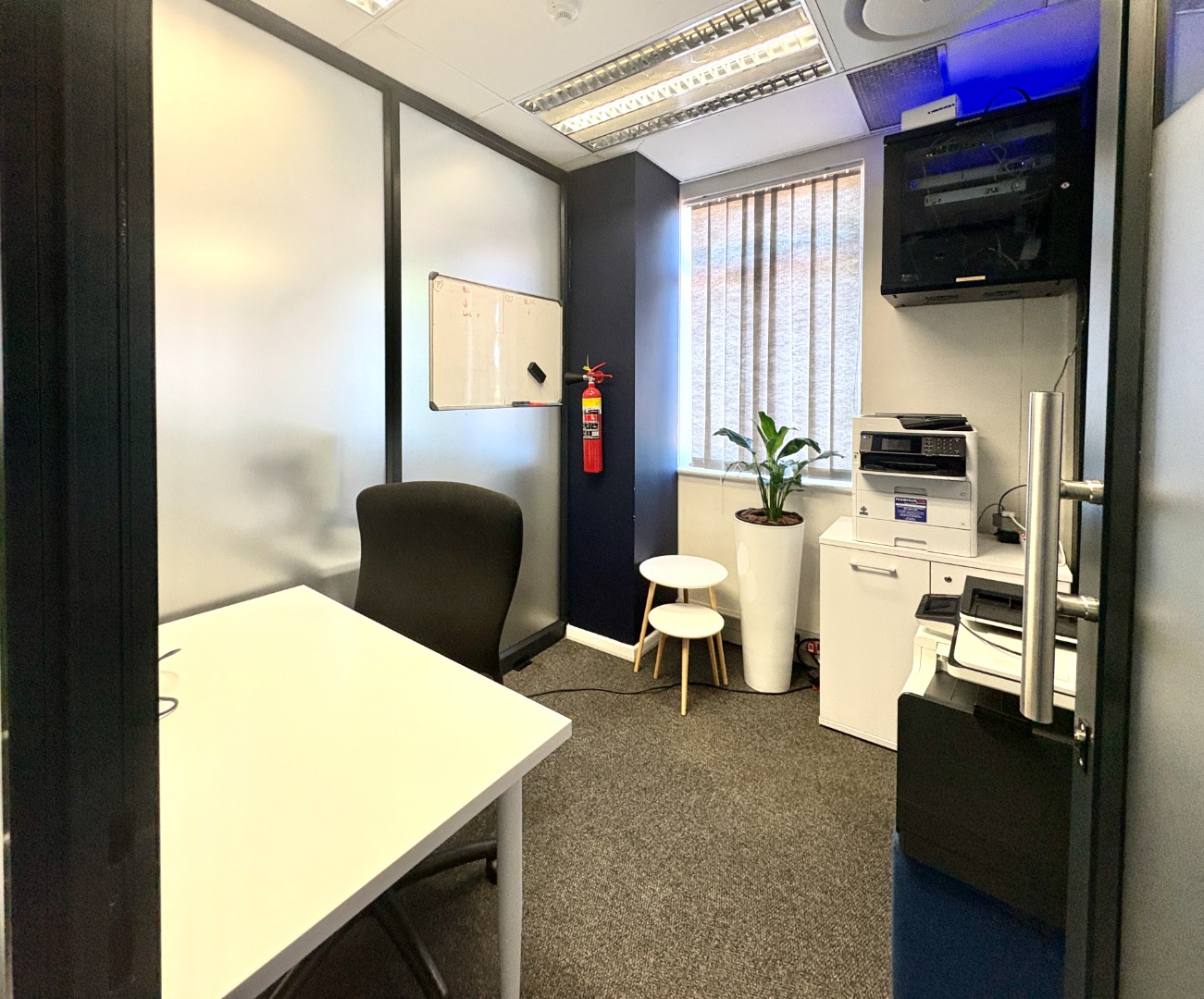 Comprising approximately 950 m² across three fully fitted units — one on the ground floor and two on the first — the building offers a versatile layout designed for functionality and comfort. Each office features a blend of open-plan work areas, executive offices, boardrooms, and kitchen facilities, with shared restrooms conveniently located on each level. The design promotes both collaboration and privacy, ideal for dynamic, growing businesses.