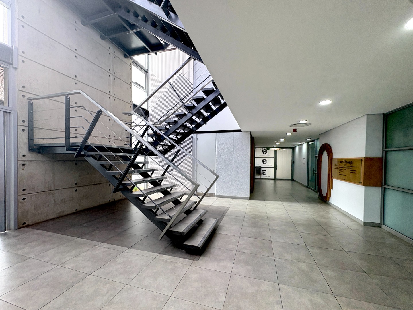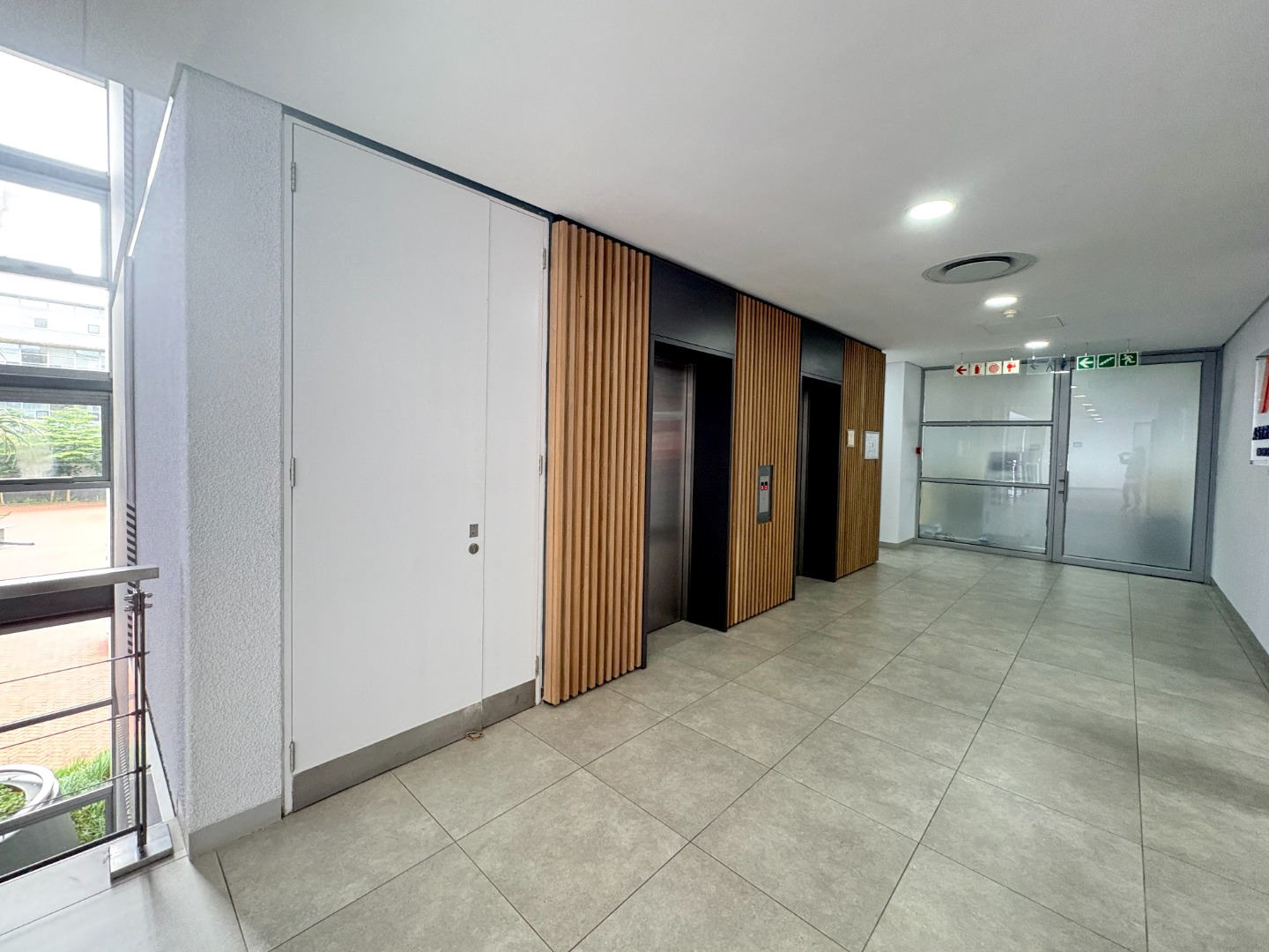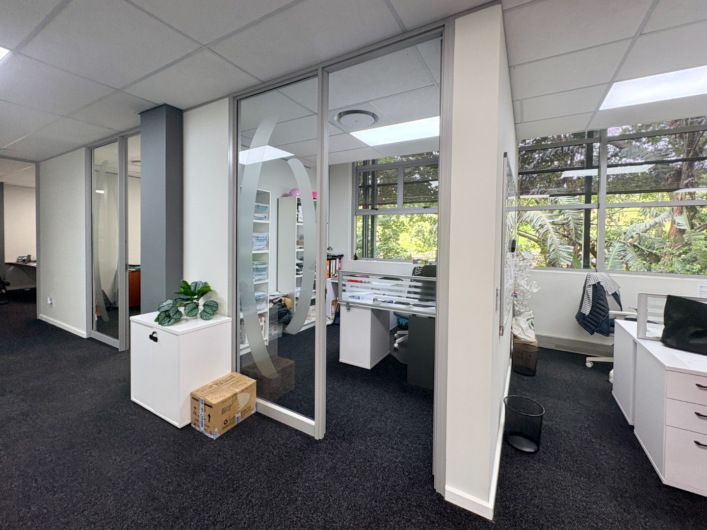 Situated on the first floor, this fully fitted 238 m² office suite is designed for immediate occupation and provides a practical, well-balanced layout. The unit includes four private offices, a well-appointed boardroom, and a generous open-plan workspace that supports collaborative working or departmental flexibility. A dedicated kitchen forms part of the suite for added convenience, while shared, serviced ablutions are easily accessible on the floor.