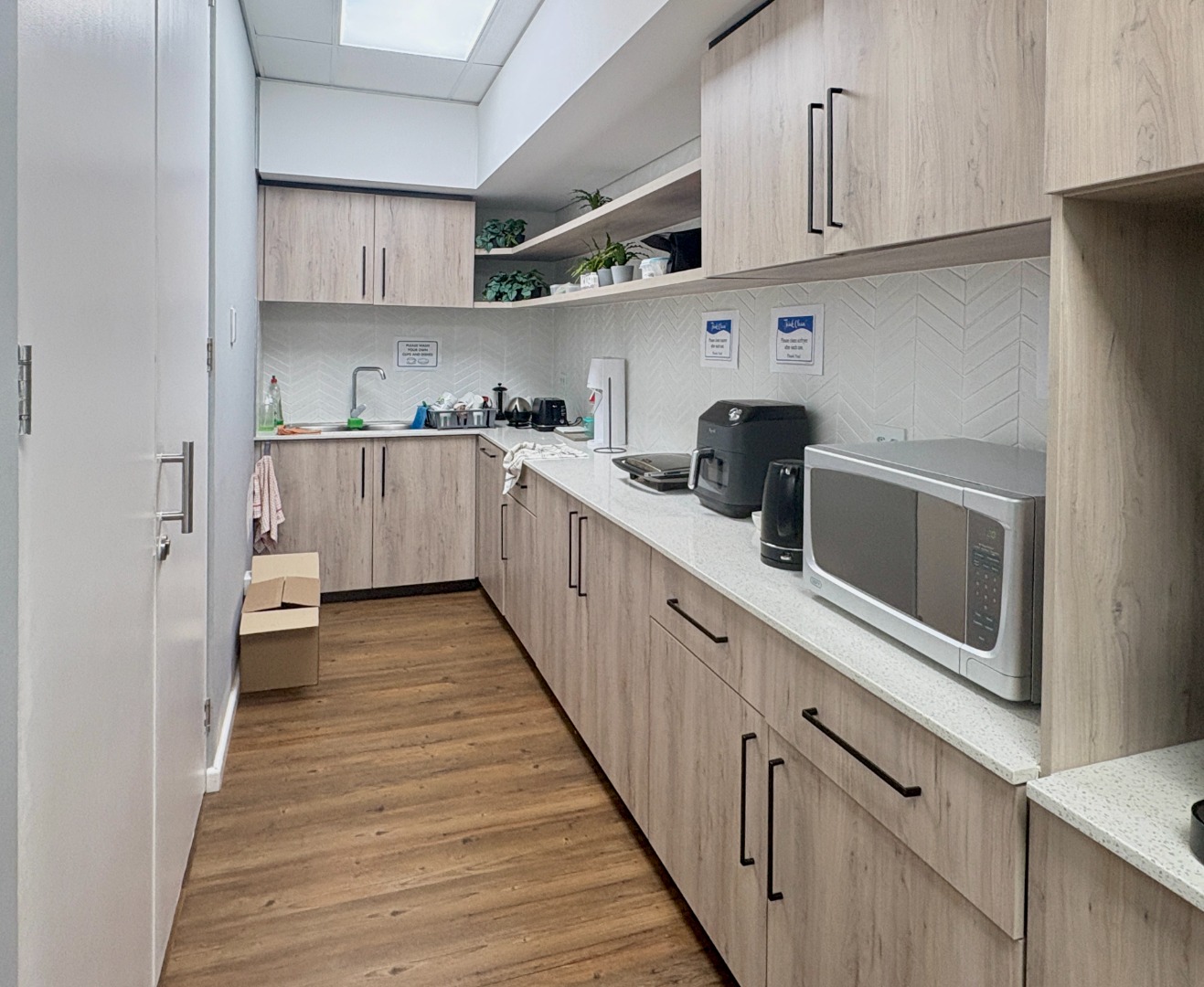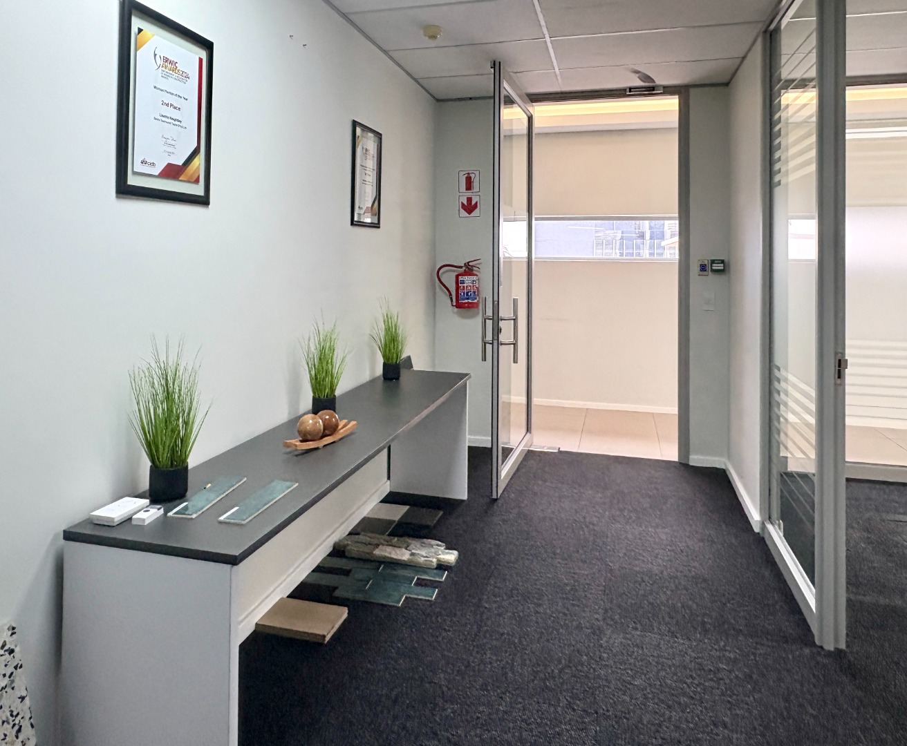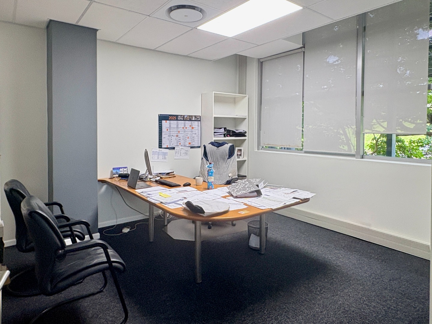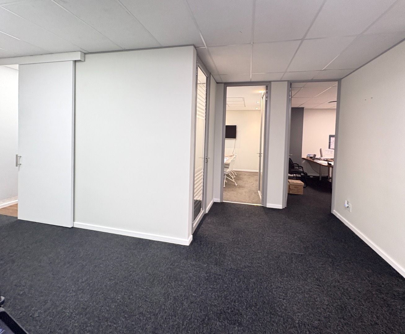 Situated on the first floor, this fully fitted 238 m² office suite is designed for immediate occupation and provides a practical, well-balanced layout. The unit includes four private offices, a well-appointed boardroom, and a generous open-plan workspace that supports collaborative working or departmental flexibility. A dedicated kitchen forms part of the suite for added convenience, while shared, serviced ablutions are easily accessible on the floor.